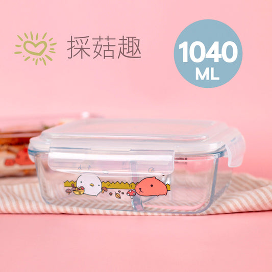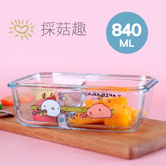 日本【水豚君KAPIBARASAN】 長形分隔玻璃保鮮盒840ML-採菇趣