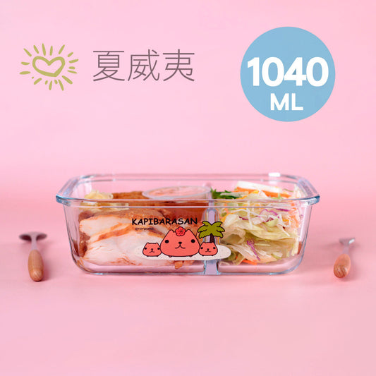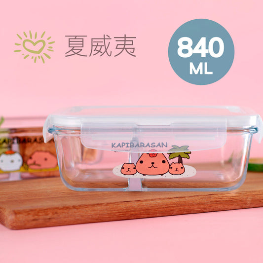 日本【水豚君KAPIBARASAN】 長形分隔玻璃保鮮盒840ML-夏威夷