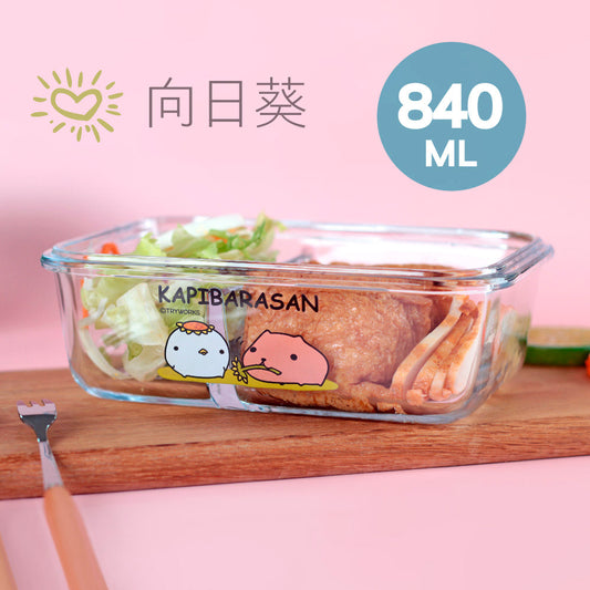 日本【水豚君KAPIBARASAN】 長形分隔玻璃保鮮盒840ML-向日葵