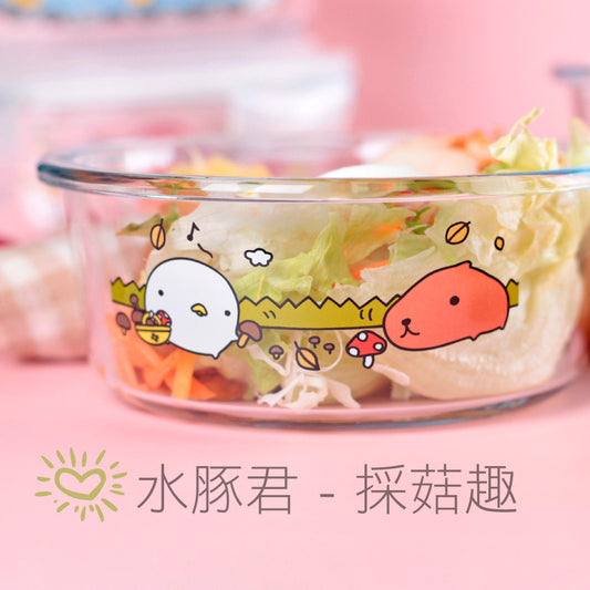 日本【水豚君KAPIBARASAN】圓形玻璃保鮮盒620ML-採菇趣