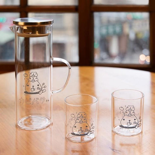 日本【水豚君KAPIBARASAN】耐熱玻璃壺雙杯組(藍)