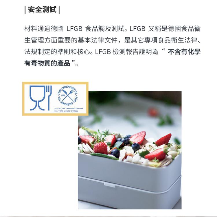 本產品通過德國LFGB及美國FDA的食品觸級標準檢驗, LFGB及FDA是歐洲及美國食品衛生管理方面重要的法律文件,是專項食品衛生法律、法規制定的準則和核心,產品品質堪稱便當盒中的精品,為您的安全健康保駕護航。