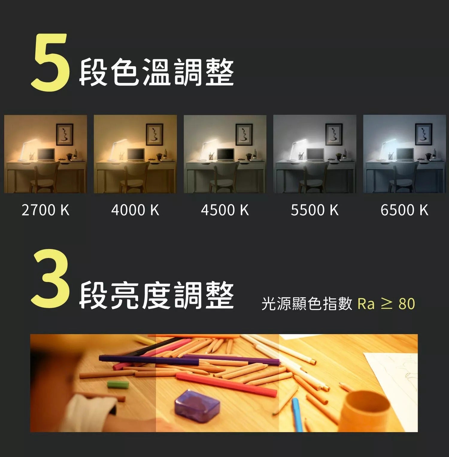 • 5階段色溫調整、3階段亮度調整