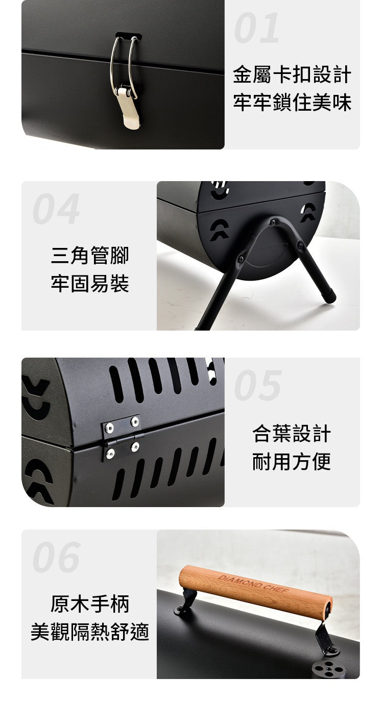 • 多功能把手設計,隨時隨地帶上燒烤美味