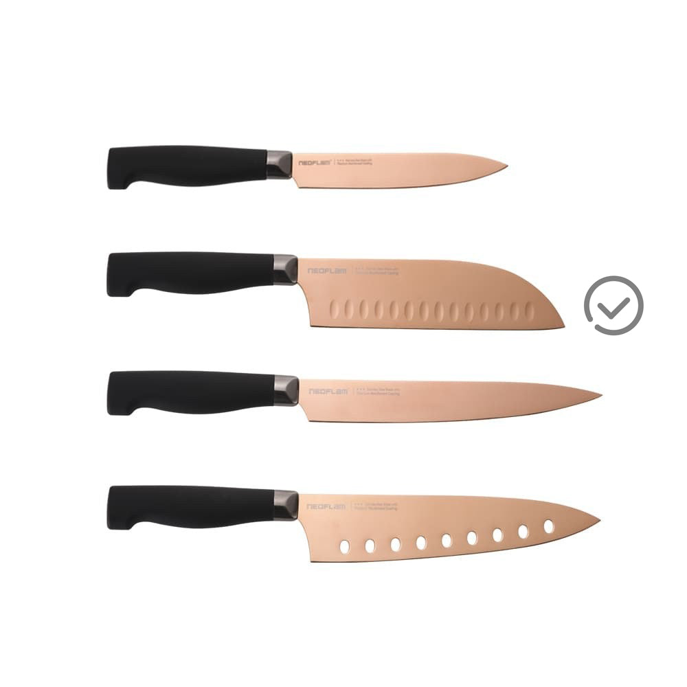 • 刀具四件組,包含多用途刀、三德刀、薄片刀與主廚刀,滿足您各式料理需求。