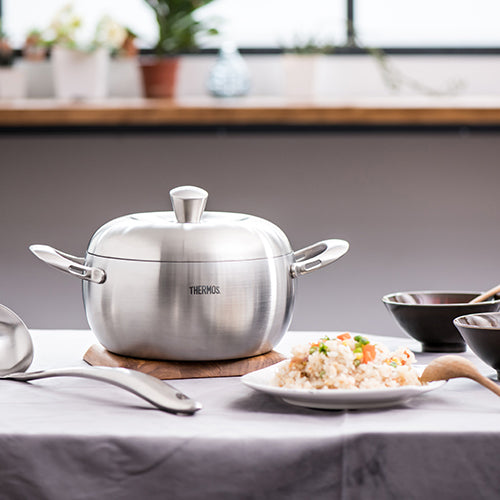鍋內採用優質不鏽鋼,材質穩定度佳,不易因熱與食材產生化學作用;多層複合金鍋身一體成型,導熱迅速受熱均勻,中小火烹調即可。